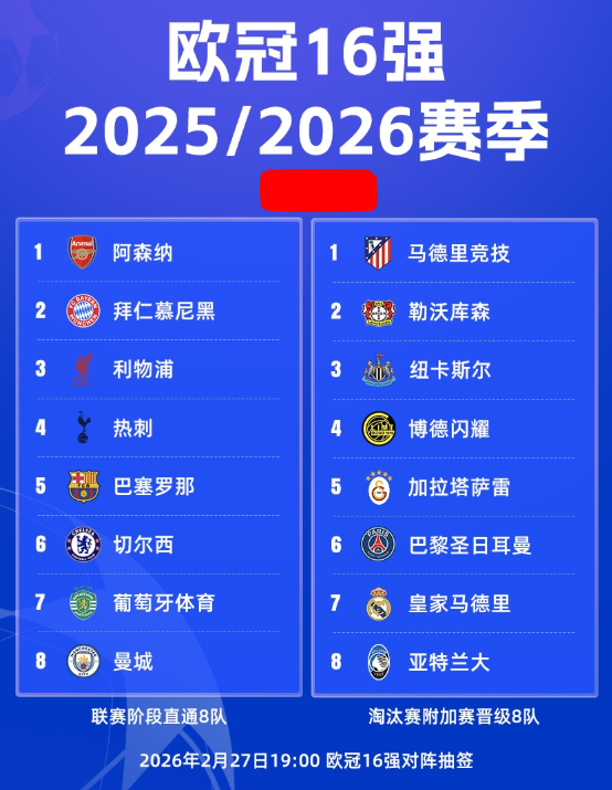 北京时间2月26日凌晨,欧冠淘汰赛附加赛次回合第二比赛日结束剩余四场较量,本赛季欧冠16强全部出炉,抽签仪式将于北京时间2月27日19:00举行。16强席位中,英超球队延续强势表现,6支参赛队伍展现出碾压级的集团优势——其中5支(阿森纳、利物浦、热刺、切尔西、曼城)在联赛阶段便跻身前八直通淘汰赛;唯一未能直接晋级的纽卡斯尔联,也在附加赛中双杀阿塞拜疆超级联赛劲旅卡拉巴赫,顺利突围。