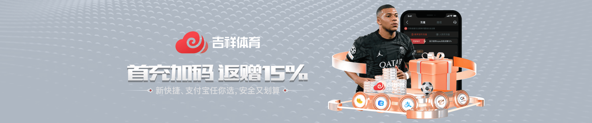 一、活动名称:首充加码15%返赠 二、活动时间:2025年10月01日起 三、活动对象:吉祥体育全体会员 四、活动内容:所有首次使用代币和新快捷支付/新支付宝支付方式进行存款的会员,即可获得首笔存款金额的15% 例如您存款1000元,红利15%,那么您将获得1000*15%=150元的红利返赠,存款赠送金额总上限为3888元。彩金以优惠卷方式派发,领取后需完成5倍流水即可提现! 存款方式 首次存款 红利返赠 上限金额 申请次数 彩金流水 新快捷支付/新支付宝支付 任意金额 15% 3888元 1次 5倍 领取方法:存款后可向在线客服申请 24小时内派发,您可以进入【个人中心】 → 【优惠中心】 → 【优惠券】 即可使用 五、活动规则: 1. 1. 本活动仅限首次使用【新快捷支付】/【新支付宝支付】进行存款的会员参与。若您并非首次使用上述任一存款方式,将无法参与此活动。  2.每位会员仅可申请一次首存优惠,若会员已通过【新支付宝支付】完成首次存款并成功申请首存优惠,则使用其他方式(如新快捷支付)将无法再次申请首存返赠。  3.新快捷支付和新支付宝支付只能申请一次首存返赠。  4. 会员存款完成后需24小时内联系客服进行申请,逾期申请视为自动放弃, 活动彩金以红包优惠卷方式进行派发,彩金需完成5倍流水,活动优惠卷支持全平台使用 。 5.此活动不予线下同性质活动共享。  6.本活动中任何会员或团体以不正当,不诚实的方式套取活动优惠者,吉祥体育将有权取消其活动资格,并无需通知冻结或关闭账号并不退还款项,且会被纳入黑名单。  7.参与本次活动的所有会员需同一手机号码、同一电子邮箱、同一IP地址、同一通信地址、同一台设备且只能由同一位会员使用,若发现重复行为,吉祥体育将有权扣除对应的本金和红利的权利。 六、了解更多活动详情,请点击【立即参与】。