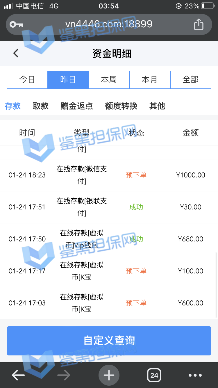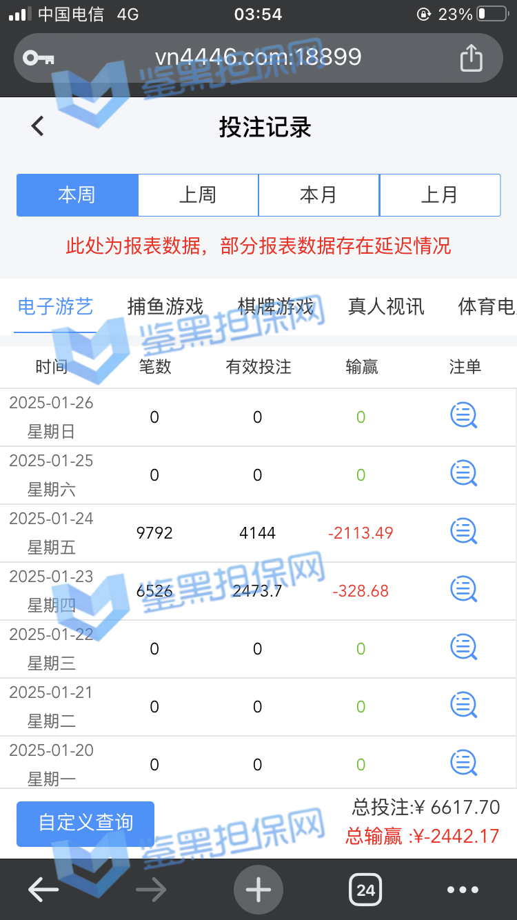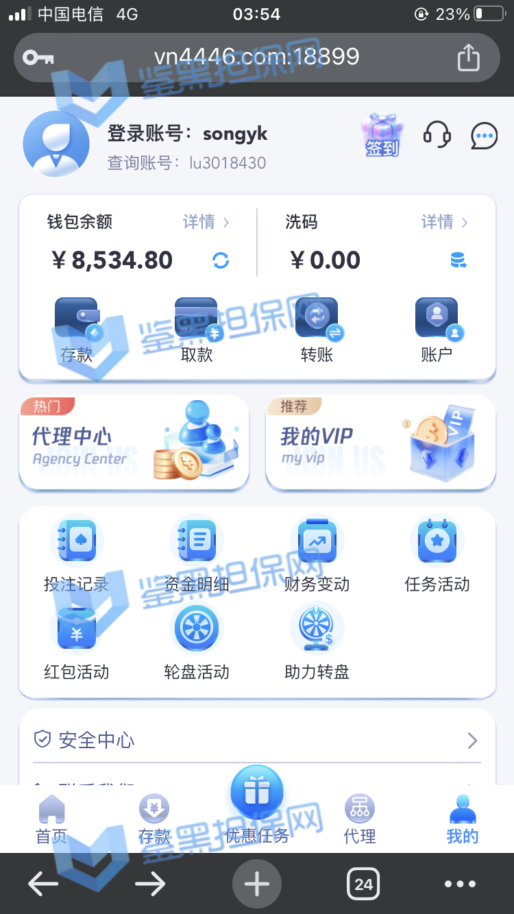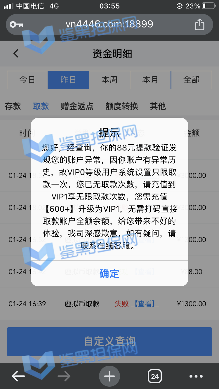 2025年1月23日下午我接到他们客服的电话邀请注册,说最高可以领288的彩金,我觉得这个平台不错挺大气的,就充了500元试试水。 因为他们平台我看是要求一倍流水提现,所以我就打到1300元申请了第一次提现,结果失败了,他们客服说让我打注册彩金288的5倍1440元才能提款,我就去他们指定的PG电子去打流水,当天晚上打够流水以后找他们提款再次失败,又改口说要打够提现余额的1300*5倍=6500元的流水才能提现。从第二次给我退回来以后他们给我后台修改了PG电子的赔率,损失从15%提高到50%,我一算账根本不够,然后我就又去打了百家乐,想着输完就不提,赢了就去刷流水,也是运气好,从1300元梭哈到5000多元,回来刷了一晚上的PG电子,一直到1月24日的中午,才刷够流水。1月23日刷了2000多流水亏了300多,差不多15%的亏损,第二天刷了4000多亏损超过2300元,我也没说什么,想着打够就提现吧。然后1月24日我去申请提现,客服先给我提了个88元,然后再提的时候以不足vip1为由让我继续充值700元到vip1,我又充了700,然后又去申请提现,提现后又给我拒绝了,说要我再充值1000元才能使用钱包收款,这回已经引起我的警觉了,我就和他们客服再三确认,这回充1000一定没问题了吧!他们客服拍着胸脯说百分之百一定能提现,给我保证,我就又充了一千。冲进去以后我申请提现又失败了,理由是资金风控让我再充值余额一半的钱也就是4000多元解除风控(我的资金是工资卡没有任何问题),他们客服就变成了复读机,一直让我继续充值,我说什么都没用,我说刚才不是百分之百能提现成功吗?他们也不理我,说这次百分之百能提成功。所以他们平台是输了钱算我倒霉,赢了钱就开始连环套路骗钱的骗子平台 以下是我经过技术手段查到的该平台的所有域名(我本人是计算机科班出身) 威尼斯人: wn88.vip vn600.top vn601.top vn602.top vn603.top vn604.top vn605.top vn606.top vn607.top vn608.top vn609.top vn610.top wn880.top wn881.top wn882.top wn883.top wn884.top wn885.top wn886.top wn887.top wn888.top wn889.top wn890.top wn891.top wn892.top wn893.top wn894.top wn895.top wn896.top wn897.top wn898.top wn899.top vn4456.com vn4457.com 81157.cc 元大娱乐城(同一个主体运营的另一家平台): yd7575.com yd9568.com yd3637.com yd3690.com yd5748.com yd9928.com yd3657.com yd2234.com yd1238.com yd1239.com yd1237.com yd2235.com yd1230.com yd1236.com yd1235.com
