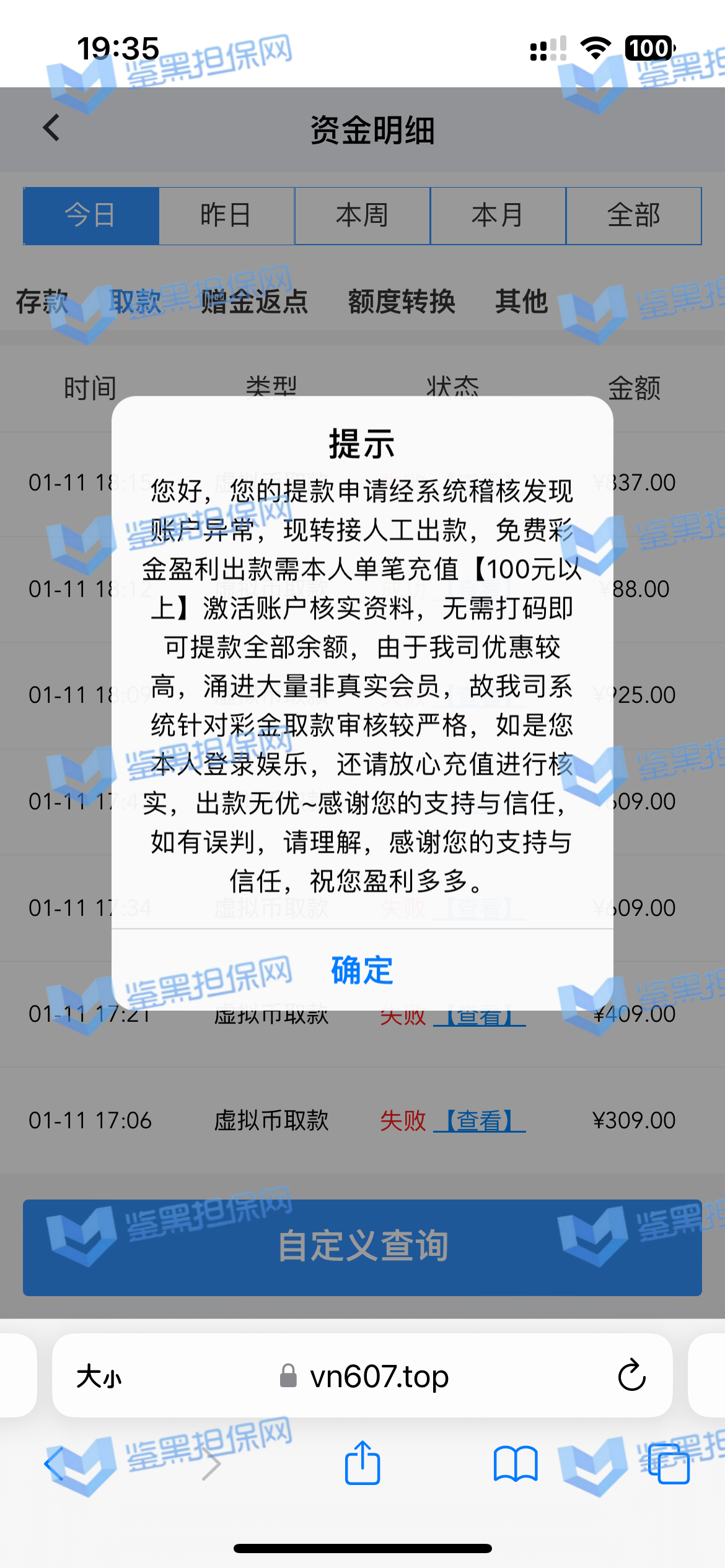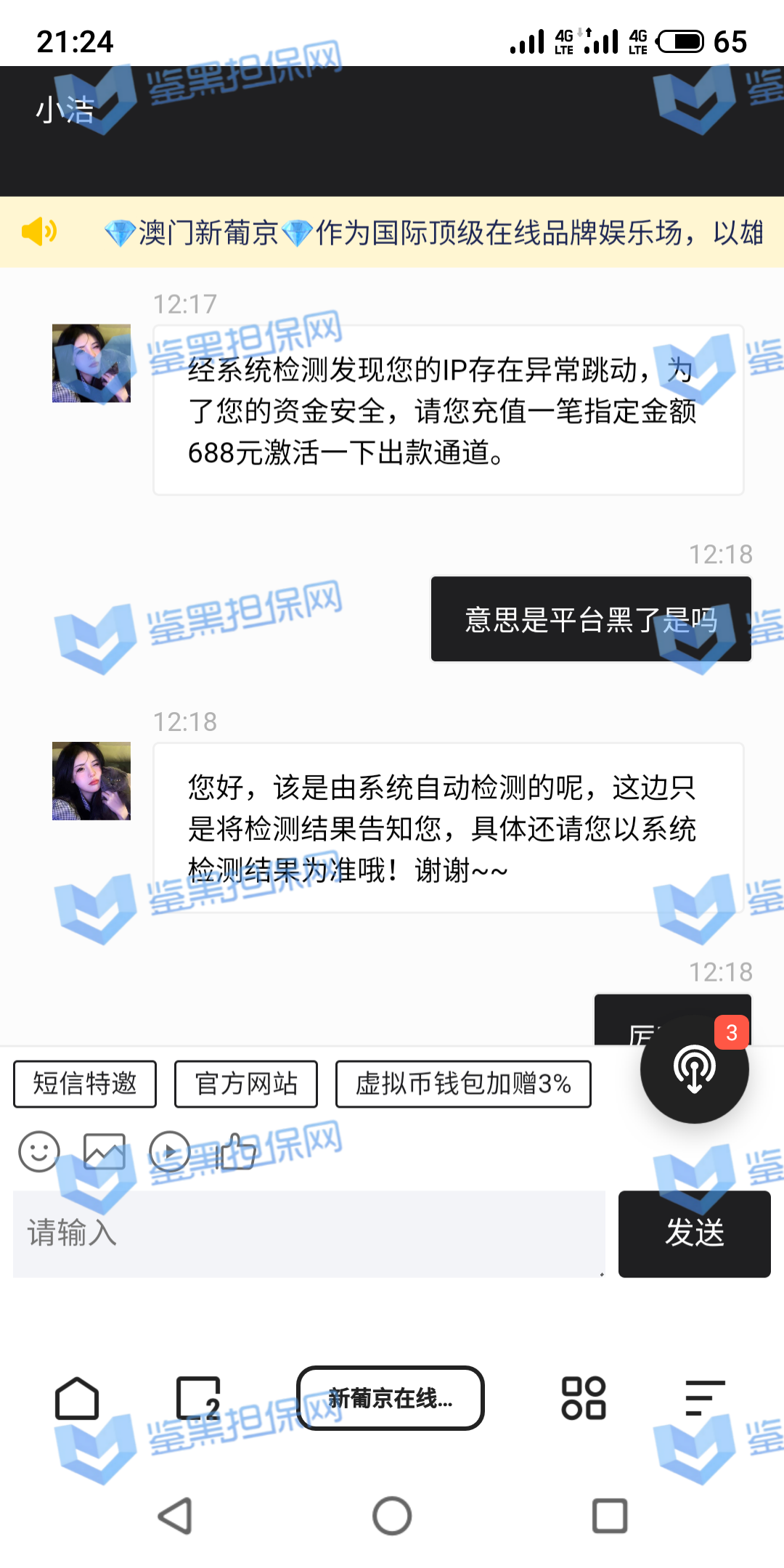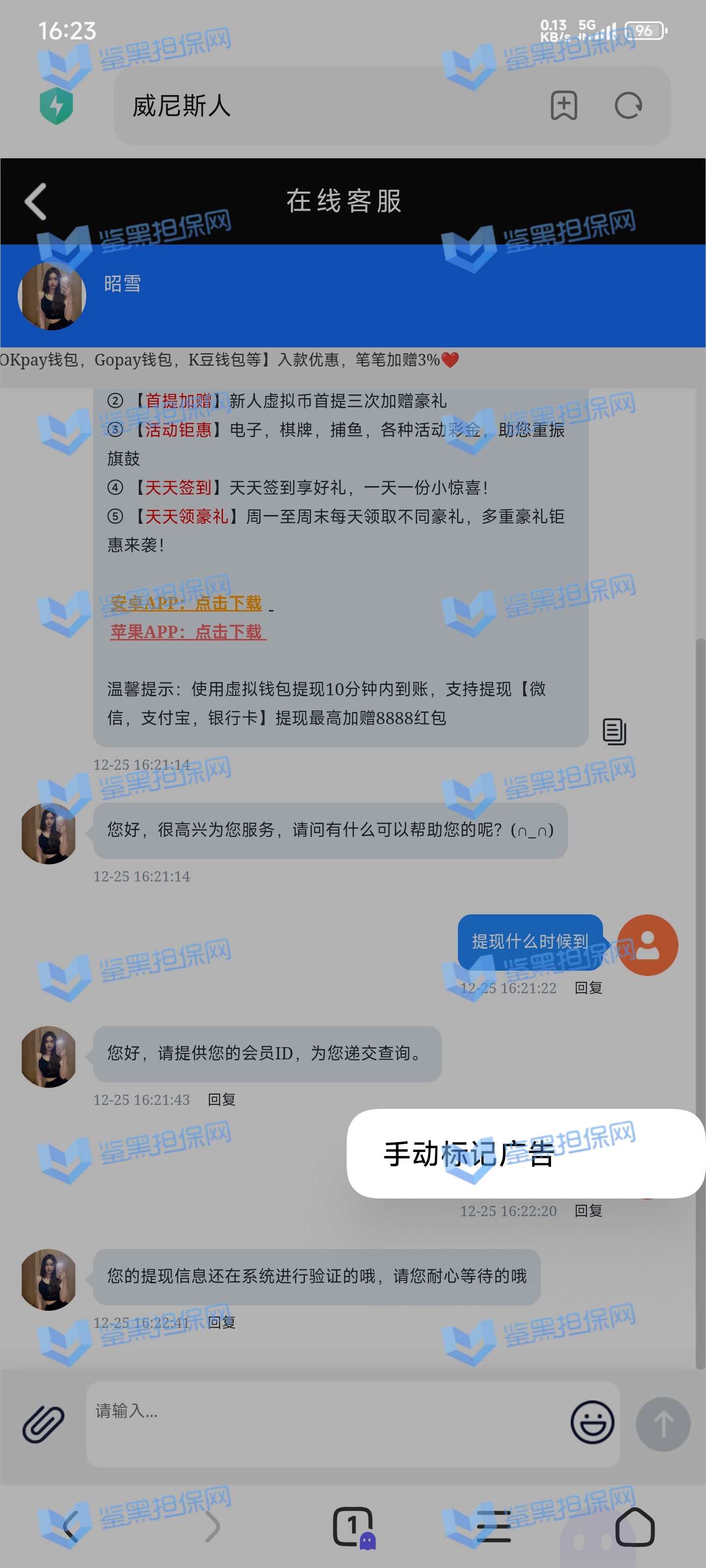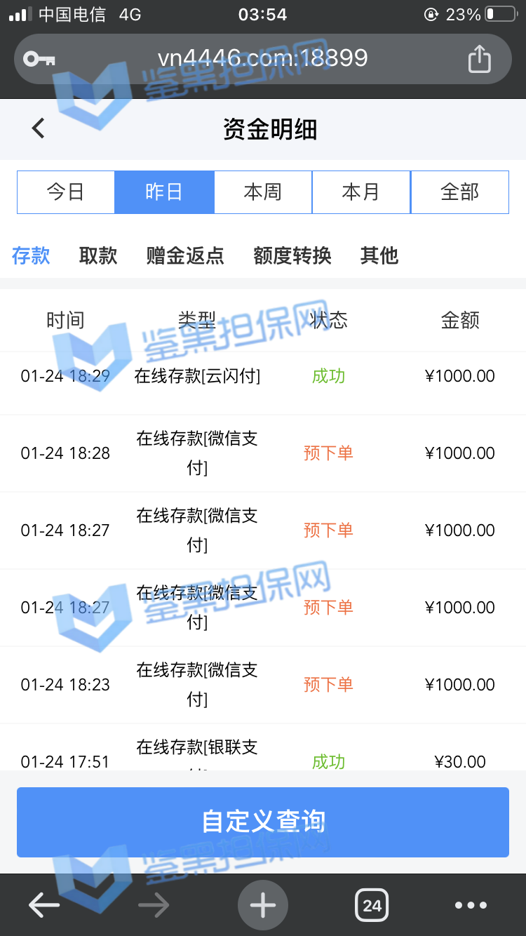 2025年1月23日下午我接到他们客服的电话邀请注册,说最高可以领288的彩金,我觉得这个平台不错挺大气的,就充了500元试试水。 因为他们平台我看是要求一倍流水提现,所以我就打到1300元申请了第一次提现,结果失败了,他们客服说让我打注册彩金288的5倍1440元才能提款,我就去他们指定的PG电子去打流水,当天晚上打够流水以后找他们提款再次失败,又改口说要打够提现余额的1300*5倍=6500元的流水才能提现。从第二次给我退回来以后他们给我后台修改了PG电子的赔率,损失从15%提高到50%,我一算账根本不够,然后我就又去打了百家乐,想着输完就不提,赢了就去刷流水,也是运气好,从1300元梭哈到5000多元,回来刷了一晚上的PG电子,一直到1月24日的中午,才刷够流水。1月23日刷了2000多流水亏了300多,差不多15%的亏损,第二天刷了4000多亏损超过2300元,我也没说什么,想着打够就提现吧。然后1月24日我去申请提现,客服先给我提了个88元,然后再提的时候以不足vip1为由让我继续充值700元到vip1,我又充了700,然后又去申请提现,提现后又给我拒绝了,说要我再充值1000元才能使用钱包收款,这回已经引起我的警觉了,我就和他们客服再三确认,这回充1000一定没问题了吧!他们客服拍着胸脯说百分之百一定能提现,给我保证,我就又充了一千。冲进去以后我申请提现又失败了,理由是资金风控让我再充值余额一半的钱也就是4000多元解除风控(我的资金是工资卡没有任何问题),他们客服就变成了复读机,一直让我继续充值,我说什么都没用,我说刚才不是百分之百能提现成功吗?他们也不理我,说这次百分之百能提成功。所以他们平台是输了钱算我倒霉,赢了钱就开始连环套路骗钱的骗子平台 以下是我经过技术手段查到的该平台的所有域名(我本人是计算机科班出身) 威尼斯人: wn88.vip vn600.top vn601.top vn602.top vn603.top vn604.top vn605.top vn606.top vn607.top vn608.top vn609.top vn610.top wn880.top wn881.top wn882.top wn883.top wn884.top wn885.top wn886.top wn887.top wn888.top wn889.top wn890.top wn891.top wn892.top wn893.top wn894.top wn895.top wn896.top wn897.top wn898.top wn899.top vn4456.com vn4457.com 81157.cc 元大娱乐城(同一个主体运营的另一家平台): yd7575.com yd9568.com yd3637.com yd3690.com yd5748.com yd9928.com yd3657.com yd2234.com yd1238.com yd1239.com yd1237.com yd2235.com yd1230.com yd1236.com yd1235.com