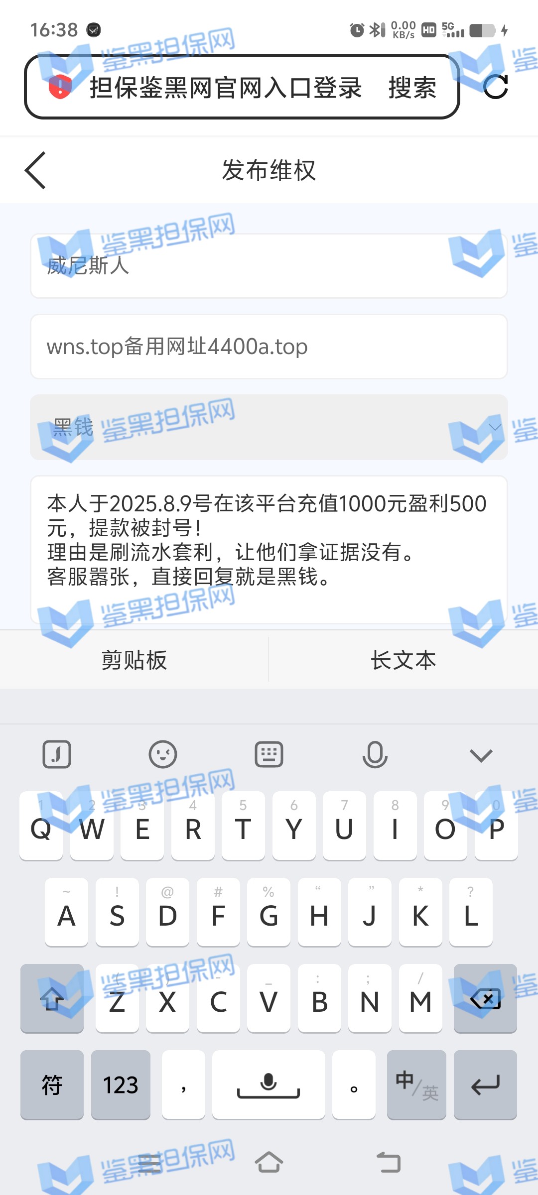 4.用户提交维权需为本人提交,若代替让人发布维权鉴黑担保网将拒绝受理;